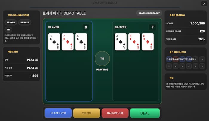 플레이어, 뱅커, 타이(Tie) 선택 영역과 최근 결과 표시를 통해 데모 플레이의 재미와 몰입감을 높였습니다.